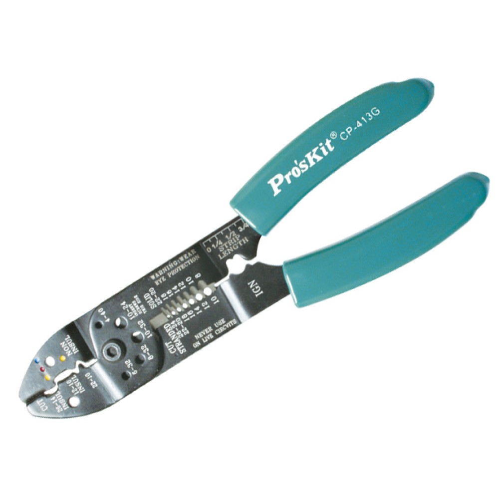 Усиленные клещи для обжима и зачистки Pro'sKit CP-413G. Стриппер для одиночного и многожильного провода и кримпер для изолированных и неизолированных зажимов с болторезом в одном инструменте.
