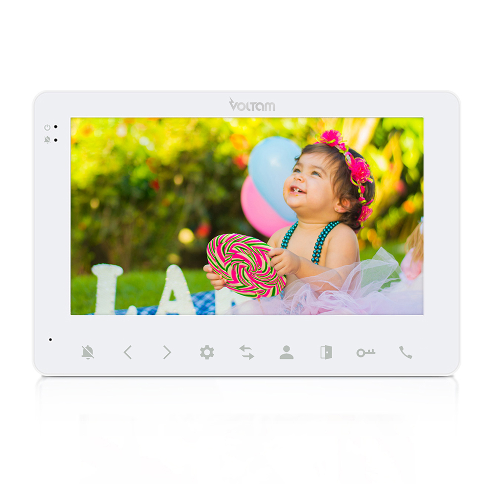 Цветной CVBS монитор для домофона VOLTAM VD-02 с сенсорными кнопками управления, функцией фото- и видеозаписи на карту SD до 128 Гб. К нему можно подключить две вызывные панели и две дополнительные видеокамеры стандарта CVBS.