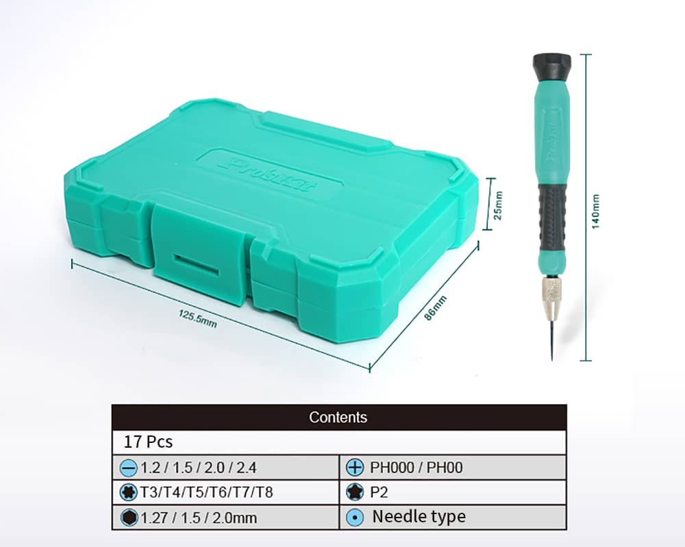 В набор входят насадки: -1,2/1,5/2,0/2,4, +PH000/PH00, T3/T4/T5/T6/T7/T8, P2, шестигранники 1,27/1,5/2мм, шило